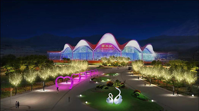 火车站主题为“心心相印”。利用心形拱门、天鹅灯雕表现爱心主题,表现浪漫气氛,同时也体现丽水的优良生态环境,天鹅可动态变化。