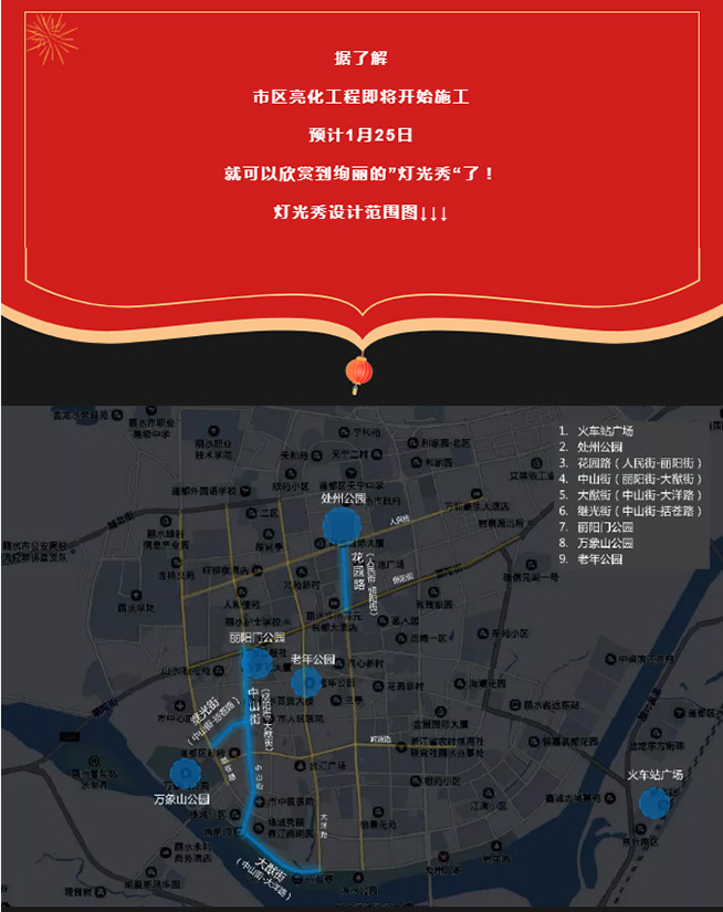 2022年丽水市区春节临时亮化工程将对市区处州公园、花园路(人民街-丽阳街)、中山街(丽阳街—大猷街)、大猷街(中山街-大洋路)、继光街(中山街-括苍路)、火车站广场、丽阳门公园、万象山公园、老年公园等路段和节点进行临时亮化。