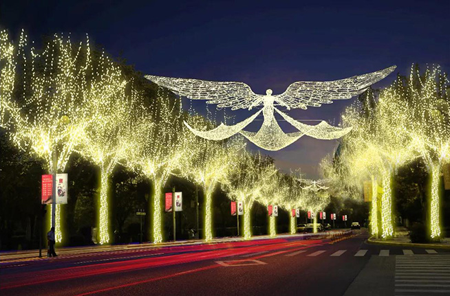 主题:“浪漫大猷”。道路上设置“天使”灯饰寓意可爱、吉祥;树冠满天星灯串,烘托节日氛围。