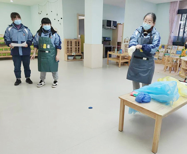 现场操作环节中,保育员们边操作边解说关于呕吐物的处置、消毒液的配比、有害垃圾桶的消毒以及桌面地面清洁消毒的流程等,动作娴熟。