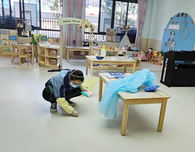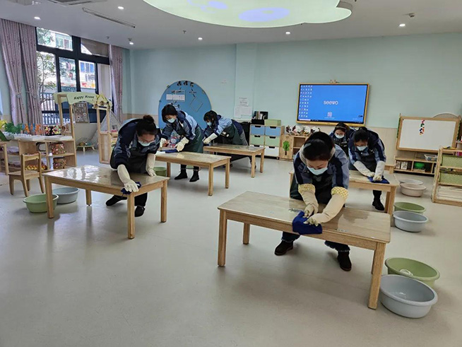 桌面消毒看似简单,实则不易。在技能实操桌面清洁比赛中,无论是消毒水比例的调配,还是擦桌子的顺序和方法,保育员们都能驾轻就熟,严格按照操作流程:清水——消毒水——清水的顺序,由远到近,由内到外走Z字形把桌面、桌角等擦得干干净净!