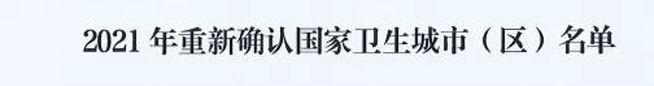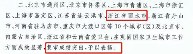 设为首页2022年1月26日,全国爱卫会印发《全国爱卫会关于2021年度国家卫生城镇复审结果的通报》(全爱卫发〔2022〕1号),参加复评的270个城市中,丽水市以全国第七名的成绩通过复审,并得到全国爱卫会通报表扬。