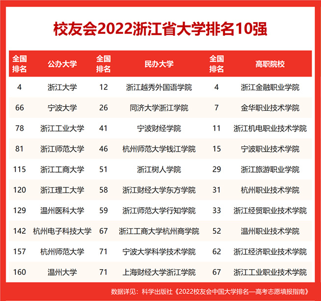 为了给2022年全国高考考生选择报考浙江省高校提供参考指南,2022年1月25日,全国第三方大学评价机构艾瑞深校友会网(Cuaa.Net)正式发布《2022校友会中国大学排名—高考志愿填报指南》,最新发布校友会2022浙江省大学排名,浙江大学等1所大学挺进全国5强,宁波大学、浙江工业大学、浙江师范大学等入围全国100强。