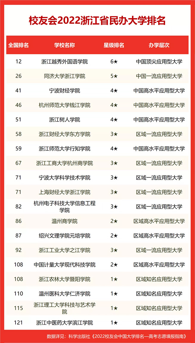 浙江越秀外国语学院雄居2022浙江省民办大学排名冠军,浙江树人学院跻身前10强