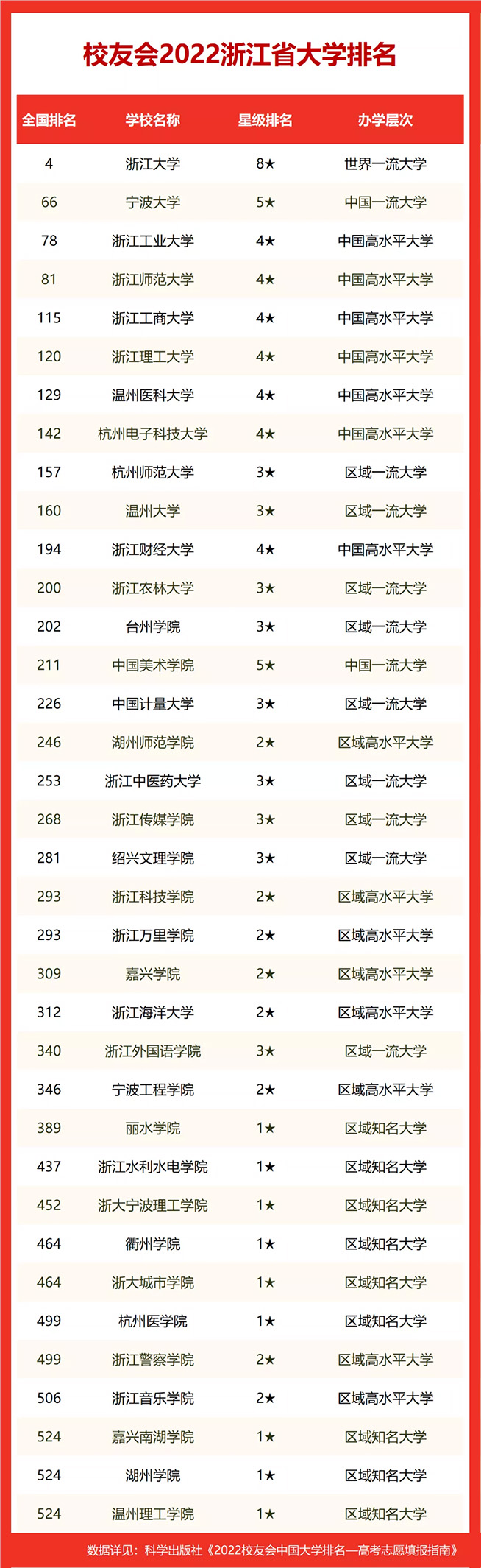 在最新2022校友会中国大学排名中,浙江大学全国排名第4名,雄居2022浙江省大学排名第一。宁波大学(第66名)居第2,浙江工业大学(第78名)列第3,名列前10强的其他高校为浙江师范大学(第81名)、浙江工商大学(第115名)、浙江理工大学(第120名)、温州医科大学(第129名)、杭州电子科技大学(第142名)、杭州师范大学(第157名)、温州大学(第160名)。
