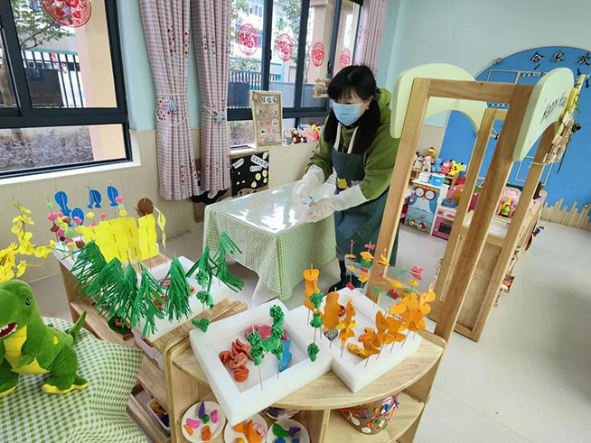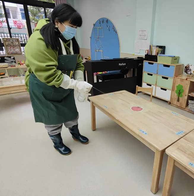 幼儿园里到处都是老师和后勤人员忙碌的身影,大家严格按照卫生消毒制度,对班级物品、门窗、地面、走廊、公共区域、厨房等地进行细致清扫消毒,做到不留死角、不留盲区,保证幼儿入园后的健康和安全。