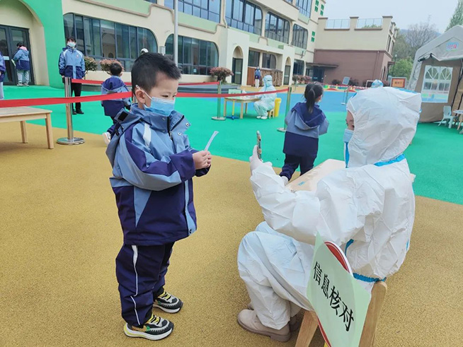 班级教师有序组织幼儿前往采样点进行采样,在等候区排好队伍依次接受测温、信息录入、核酸检测。