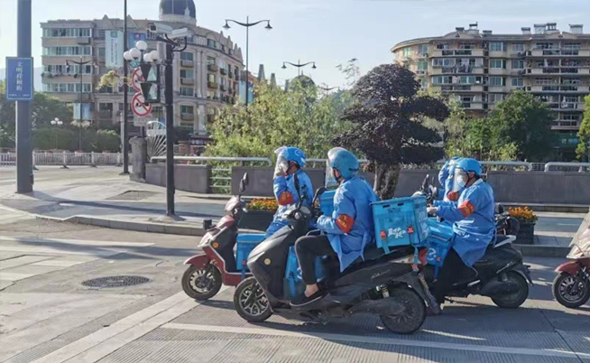 “外卖骑手负责配送餐饮至各区接驳点和指定地点,电话通知订餐人和工作人员取餐,确保全程无接触式配送。”战疫服务先锋队队长刘定华介绍,截至目前,队员平均每日配送盒饭近1000份,惠及500余人。现在特定人群每天都能准时吃上热菜热饭,心更安了,抗击疫情的信心也更足了。