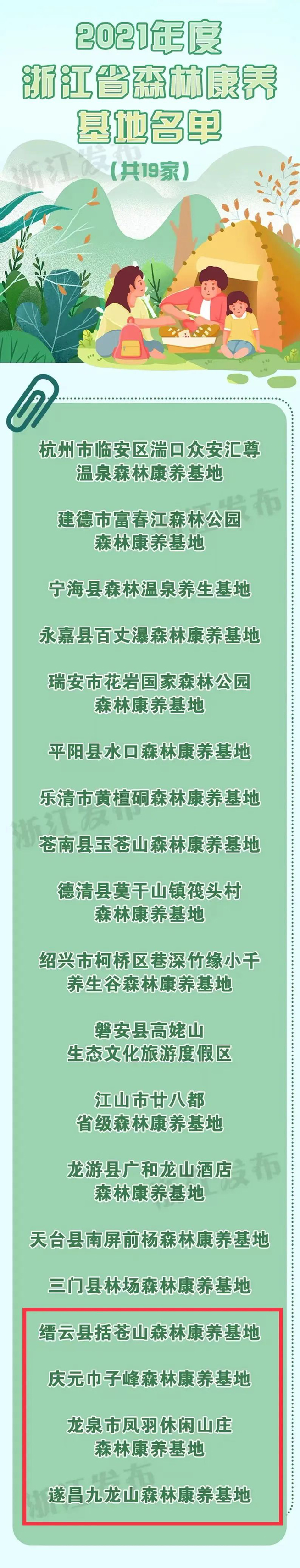 设为首页日前,省林业局、省民政厅、省卫生健康委、省中医药管理局联合印发通知,公布2021年度浙江省森林康养基地名单。截至目前,全省已培育森林康养基地51个。其中,丽水共有四家单位上榜,一起来看看都有哪些吧↓↓