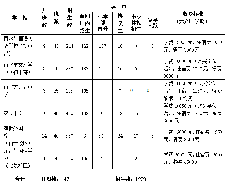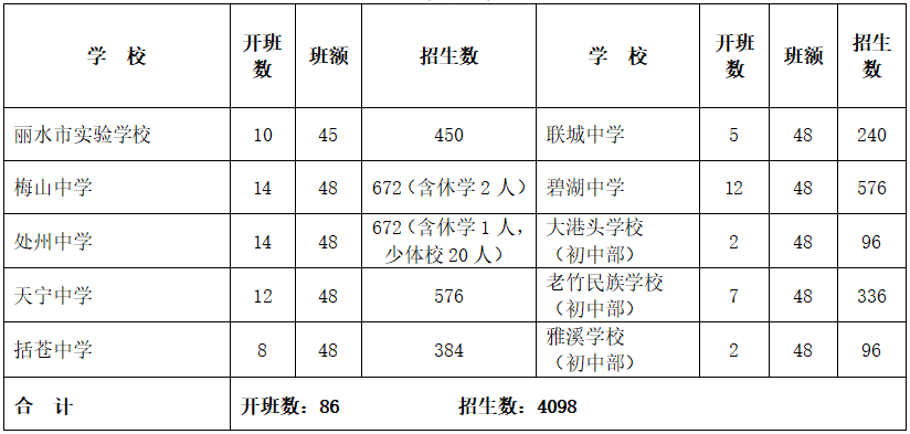 莲都区2022年初中招生计划