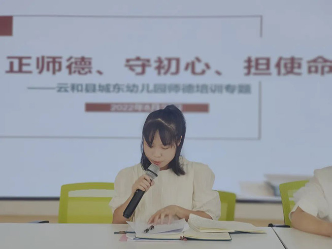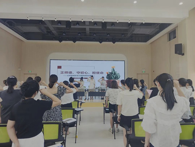 为继续加强教师团队的师德师风建设,陈斐斐副园长组织全体教职工进行师德师风培训,做到以德立身,以德立学,以德施教,以德育人。接着,全体教师进行宣誓,并签订师德师风承诺书。