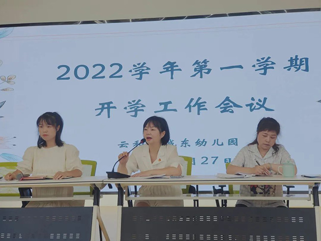 2022年8月27日上午,云和县城东幼儿园召开了2022学年第一学期开学工作会议,会议由副园长陈斐斐主持,全体教职工参加会议。