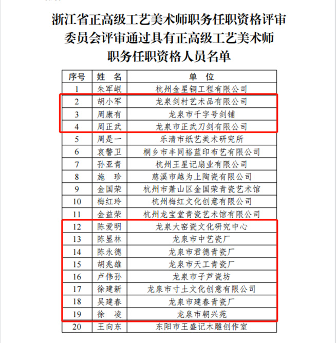 设为首页近日,浙江省经信厅、浙江省人力社保厅发文公布了首批浙江省正高级工艺美术师职务任职资格人员名单,龙泉市共有11人上榜,超全省上榜总人数四分之一。
