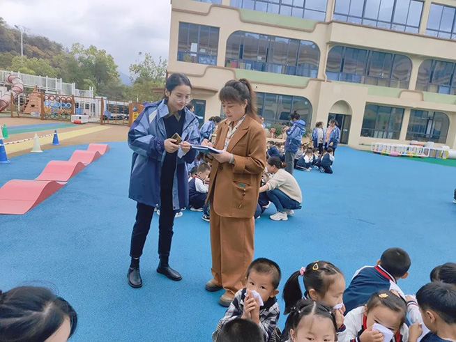 各班老师清点幼儿人数并查看幼儿情况,并向王伟霞副园长汇报班级撤离人数及幼儿情况。