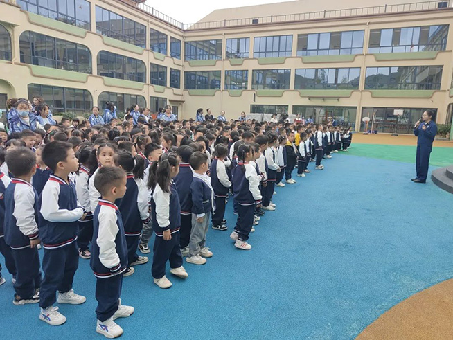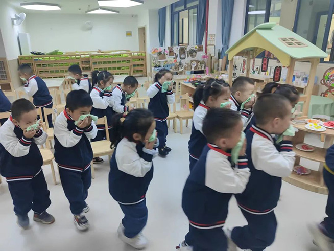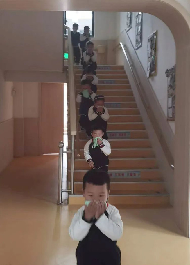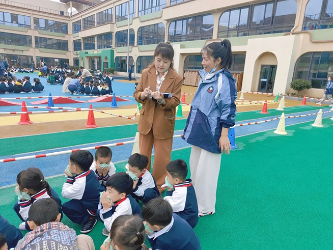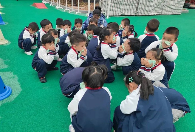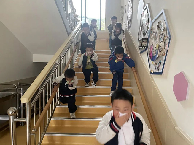 随着一声声紧急的警报声响起,各班教师迅速按紧急预案的疏散线路带领幼儿拿起湿毛巾,捂住口鼻,弯腰小步快走,从安全通道迅速、有序撤离户外安全地带。