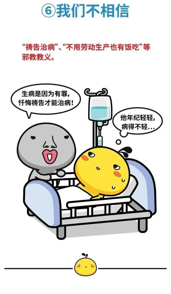 邪教欺骗群众加入的一个重要手段是声称“信教能治病”,胡说“信主可以免灾,祷告可以治病”,“只要虔诚祷告,不用打针、吃药,疾病自然会好”,不让患病的成员去医院看病,或用骗术来为成员治病。一些群众因此耽误了治疗而导致死亡,或者被邪教用巫术治死、致残。
