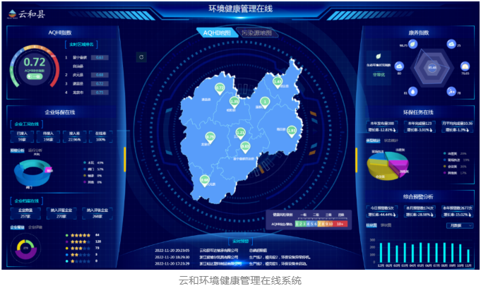 2018年,云和被列入全国首批生态环境与健康管理试点县后,着手推进环境健康风险管控,汇集污染源、企业工况、无组织扬尘、机动车尾气、水气环境质量5大监测系统数据,构建动态评估环境健康风险的“环境健康管理在线”场景应用,实时发布环境空气质量健康指数(AQHI)和生态环境康养指数(EHPI),为环境管理前期风险评估和过程风险管控提供了有效技术支撑;2021年云和县启动“无废城市”创建,创新打造“无废城市”数字化管理系统,建成一般工业固废分拣中心、一般工业固废处置中心、危险废物收储转运中心、建筑垃圾回收利用中心、生活垃圾资源化利用中心、病死猪无害化处置中心等6大平台,有效推进工业固废闭环管理、生活垃圾分类收处以及农业废弃物资源化利用。目前,云和工业固体废物安全处置率100%,生活垃圾分类处理覆盖面达100%,农业废弃物安全处置率达90%以上。2022年7月8日,在全省建设新时代美丽浙江推进大会暨生物多样性保护大会上,云和被授予全域“无废城市”建设“清源杯”,系全省首批、全市首个、山区26县唯一。