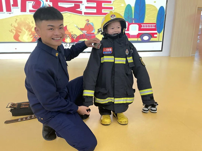 消防员叔叔向小朋友们展示了快速穿消防服,并邀请个别幼儿体验穿戴消防服。当宝贝们穿上消防服,脸上洋溢着幸福的笑容,亲身体验到作为消防员神气的感觉,更为消防员叔叔在厚重的衣物下继续开展救援工作的伟大而崇拜。