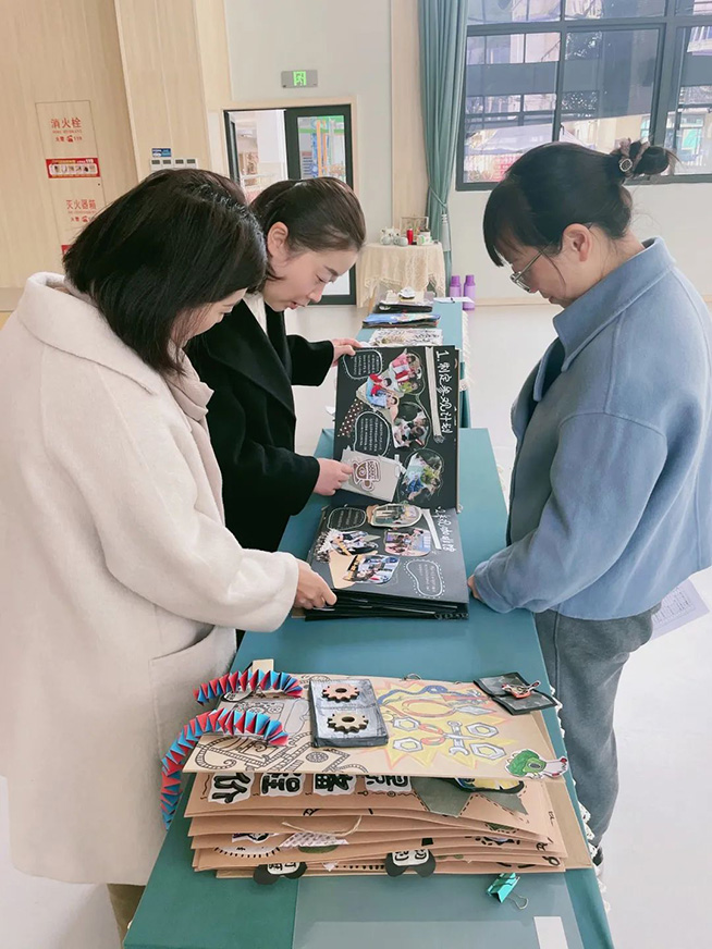 评委老师们正在仔细地翻看课程故事书,并给参评作品打分。