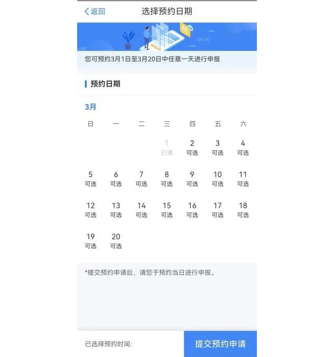 截至2月28日,个税APP显示,3月1日当天预约已满。3月2日-3月20日仍然可以预约。