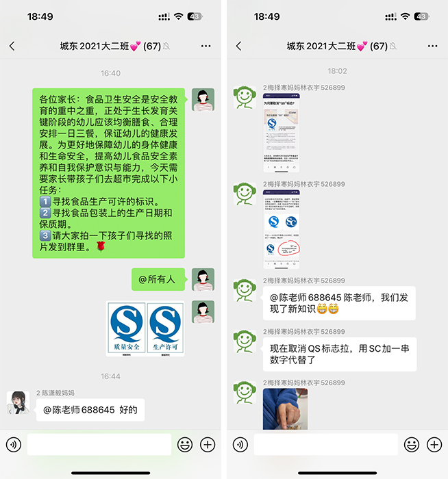 班级教师利用家长微信群向家长宣传食品安全小常识,做到提高家长食品安全意识的同时,呼吁家长在日常生活中重视对孩子的食品卫生教育。