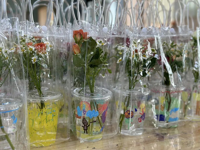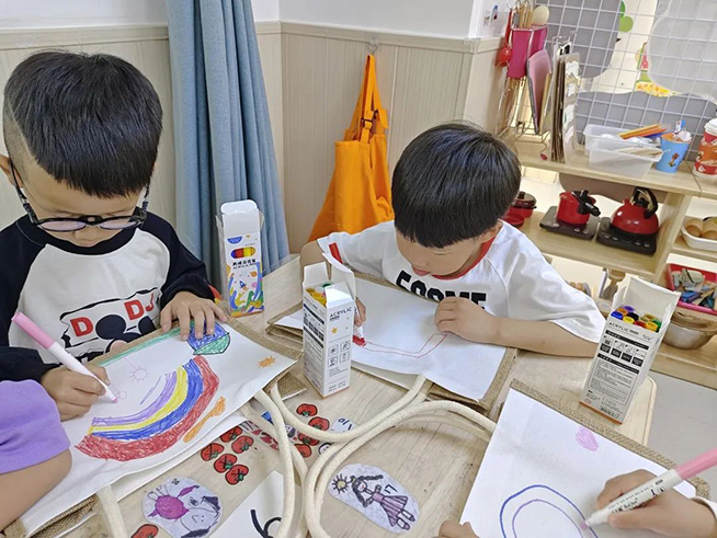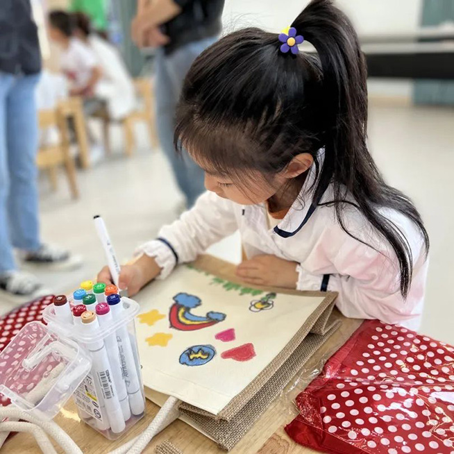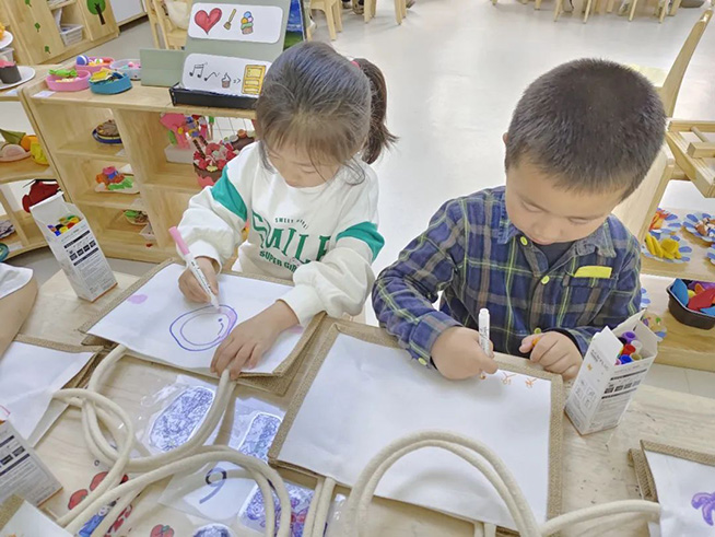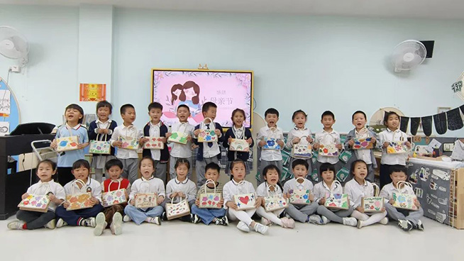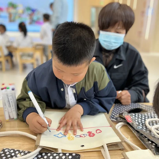 大二班联合浮云街道东门社区开展了“我和妈妈有个约绘”母亲节活动,孩子们现场手绘包包,并送给妈妈表达爱意。