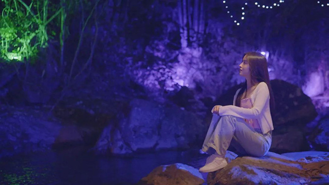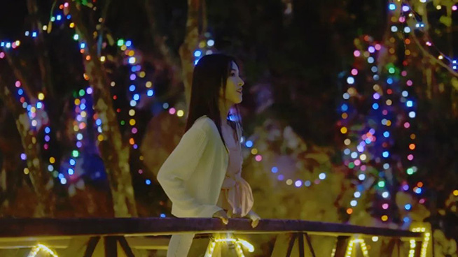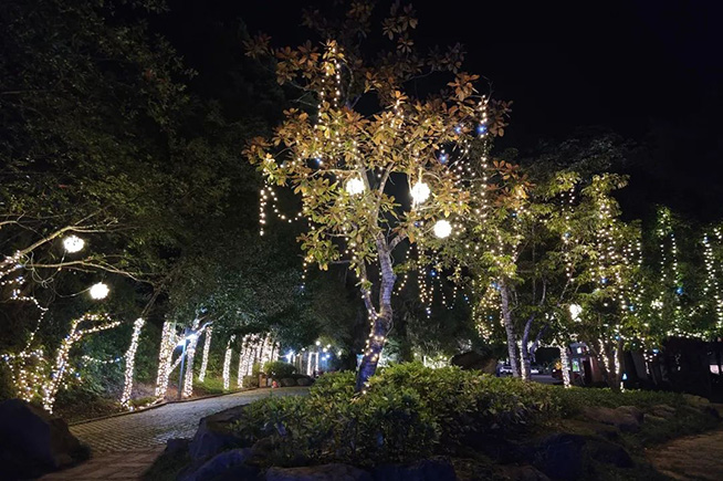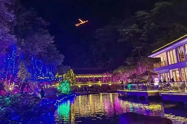 穿过山林,来到瑶池旁,星星点点的灯光浪漫到隔绝了城市的喧嚣。