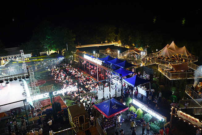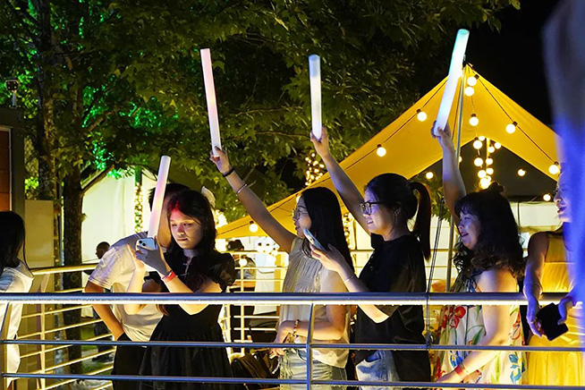 随着夜幕降临,萦绕在露营基地的橘色彩灯被点亮,温馨唯美的露营帐篷青山绿树中星星点点。当晚,大家举杯邀宾朋,听一听晚风的声音,暂时逃离疲惫的生活,共赴一场星空、营地、音乐的约定。