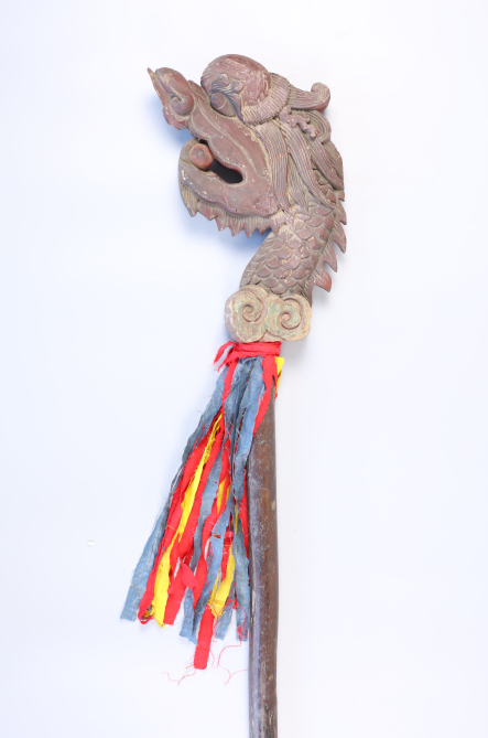 畲族,一个古老而神秘的民族,在悠久的历史和灿烂的文化演绎中,展现着独特的风姿。其中最引人注目也最能反映民族特色的就是畲族祖杖,原始祖杖存量很少,景宁畲族博物馆的清畲族龙首木祖杖是极为珍贵的畲族族宝。长212×龙首宽25cm,头部雕成龙首状,口含龙珠,龙须龙鳞雕刻线条流畅,双目烔烔有神。下部呈圆柱形。龙首漆暗红色油漆,杖身漆桐油。龙头与手持棒衔接处雕刻祥云纹,并系数红色布条,一张布条代表一个学师的人,父学师,子系父之下,孙学师,系于子之下,希望得到始祖的庇护。畲族祭祖过程非常神秘,其仪式和活动都在族内秘密进行,从不向外人透露,祖杖更是秘而不宣,绝不轻易示人,平时用红布包起由专人珍藏,除了“祭祖”“做聚头”(传师学师)、“做功德”(做阴)等重大事情里取出供奉外,其余时间不准轻易挪动,更不准随意外示。族长持有祖杖,行使权力和执行族规,对违反者将依规惩处,调解解决族中突出的大事难事,族长在决定族内大事时如果徇私,畲民可用祖杖惩戒他。清畲族龙首木祖杖是彰显畲民远祖权威的象征物,是畲族子孙世代万古相传的圣物。