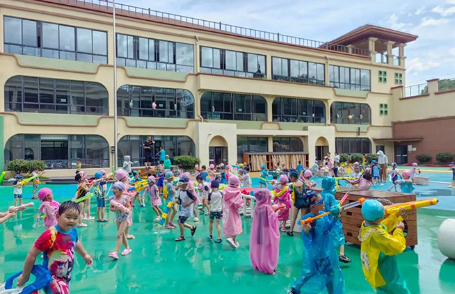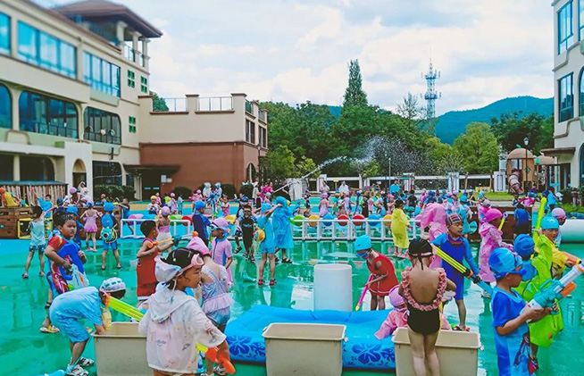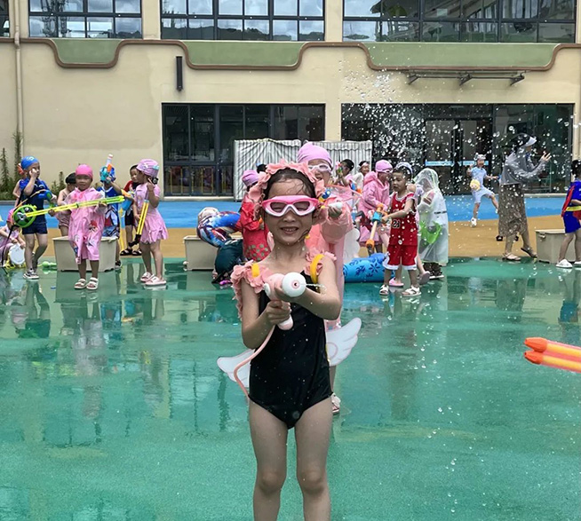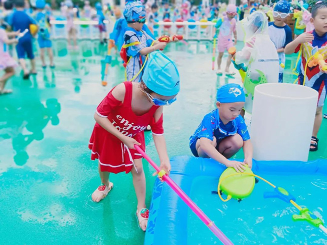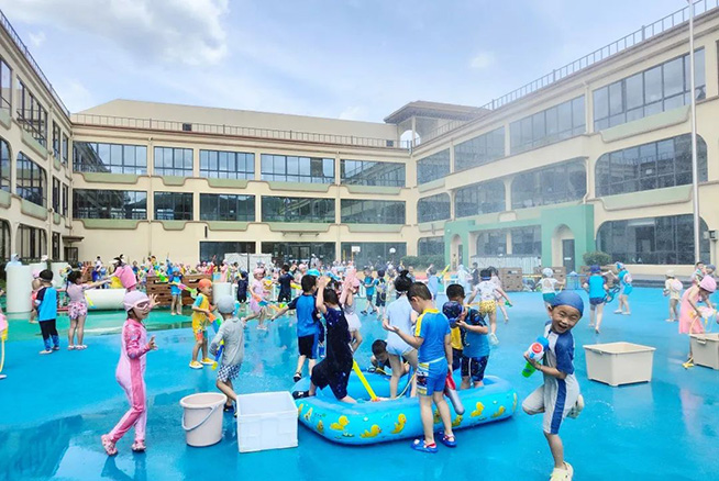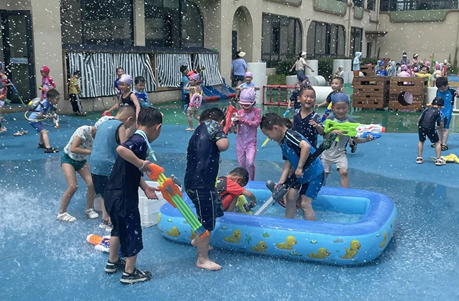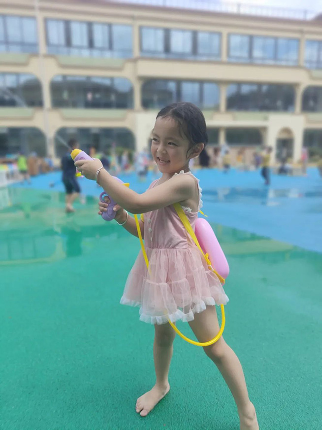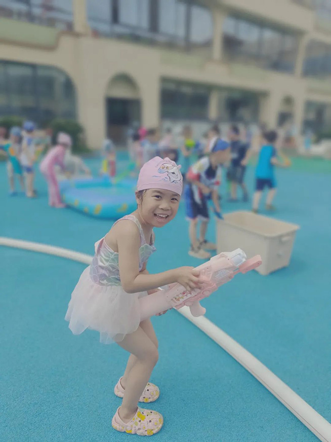 随着开战的口号响起,身着各色泳衣的孩子们拿起“武器”,冲向对战方发起猛烈进攻,飞溅的水花与飞扬的呐喊声霎时充满了整个校园,整个场地变身欢乐的海洋。