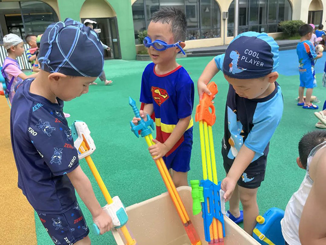 瞧!孩子们穿上泳衣、带上“武器”,一场水枪大战一触即发!