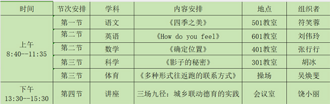 本次送教活动由符笑蓉老师带来的《四季之美》拉开序幕。符老师先回顾了之前的学习方法,再和学生一起通过学习方法学习秋之黄昏,接着提高难度,通过四人小组合作学习冬之早晨。这堂课还遵循“读书内化”的阅读教学规律,设计了“初读──精读──熟读──背诵”四个环节,学生有足够的时间直接地、反复地接触课文。从读准字音,读顺课文,到有感情地朗读,以至背诵,“以读为本”“以读代讲”的指导思想和训练的层次性十分明确。
