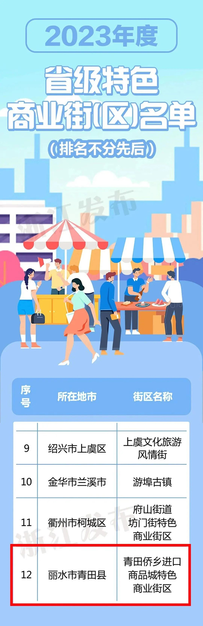 设为首页近日,省商务厅等5部门印发《关于公布2023年度浙江省高品质消费集聚区名单的通知》,确定武林路时尚街区等12条商业街(区)为省级特色商业街(区), 青田侨乡进口商品城特色商业街区 上榜,这也是全市唯一上榜街区!