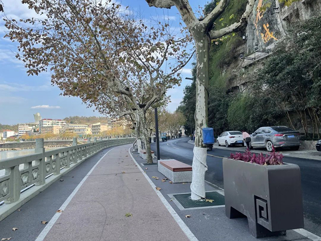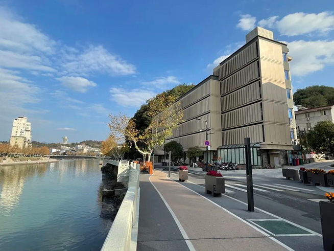 溪滨南路是缙云古城历史风貌的重要组成部分,不但是缙云进一步开展城市风貌样板区创建的先导区域,还是缙云实施“千年古城复兴计划”的开篇之作。改造提升中尤其注重延续自好溪北岸的核心商业区十字街通过铁桥连接南岸的五云桥亭和水南街的古城空间格局,以及由好溪两岸的山体共同构成的整体山水环境。并在局部区域通过拆除违章建筑和修葺山水景观,进一步疏通并强化既有的视线通廊。同时溪滨南路沿线留存了较多风貌尚可的石砌老建筑,均通过建筑加固、立面修缮、管线梳理、泛光照明等诸多措施,在延续历史风貌的基础上凸显这些镌刻在石头建筑上的岁月沧桑。