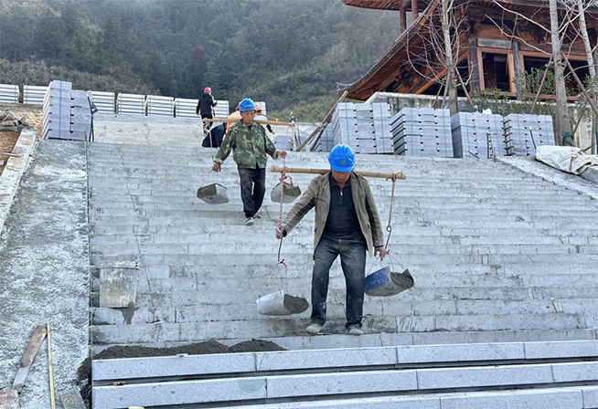 在施工现场,10余名施工人员正在登山步道上进行铺砖工作,其他200多名施工人员分散在各自点位上施工,全力冲刺工程建设节点。